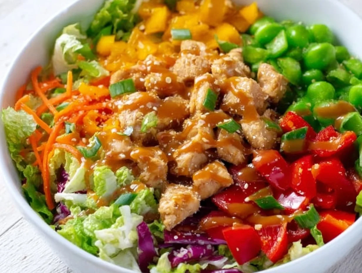 A zesty, colorful salad combining tender chicken, crunchy vegetables, and a rich peanut dressing, perfect for lunch or dinner.