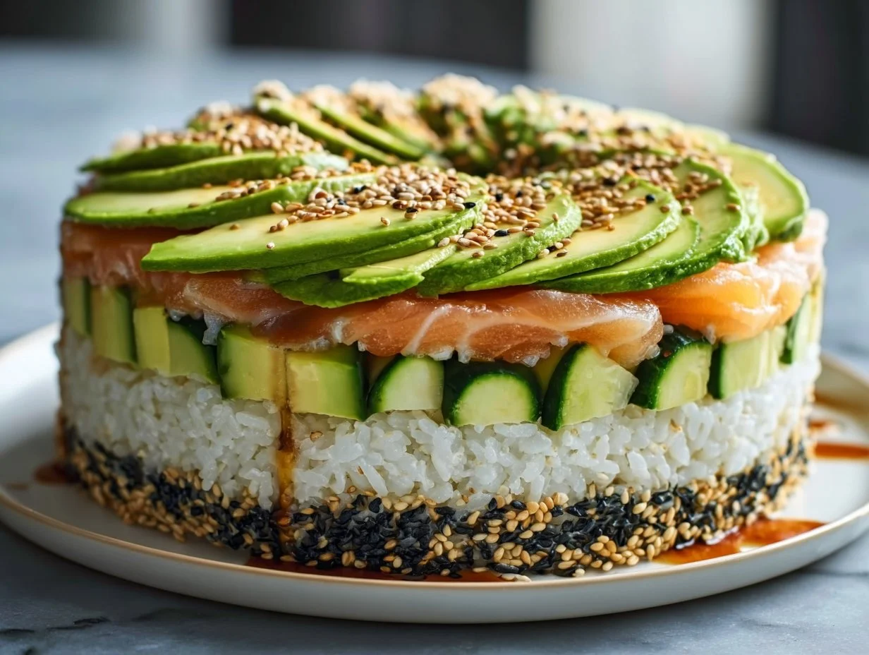 Easy-to-make avocado sushi cake is a delightful twist on traditional sushi that prioritizes flavor and visual appeal.