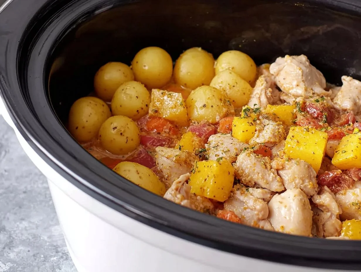 Step 6: Cover the crock pot and cook on low for 6-8 hours or on high for 3-4 hours, until the chicken is cooked through and the potatoes are tender.